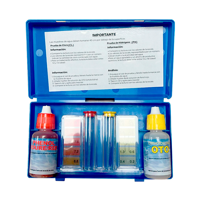 Este kit incluye reactivos de alta calidad OTO (cloro) y Fenol Rojo (pH), junto con tubos de medición graduados y un estuche plástico resistente que facilita su transporte y almacenamiento. Su uso es ideal tanto para propietarios de piscinas residenciales como para personal de mantenimiento.